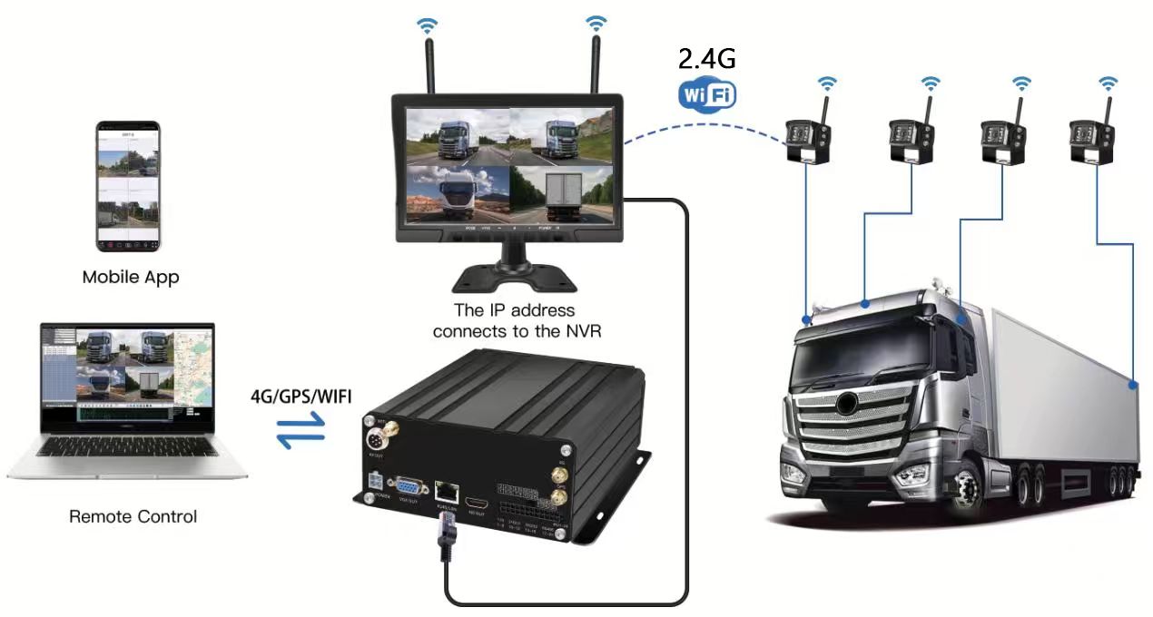 AHD-Fahrerüberwachungskamera im InnenraumCarleader 10,1 Zoll 4CH Wireless HDD Mobile NVR System, ein hochmodernes mobiles NVR-System, das für das Flottenmanagement entwickelt wurde. Das System verwendet 4 drahtlose IP-Kameras, die über ein 2,4-GHz-Signal mit einem 10,1-Zoll-Wireelss-Monitor gekoppelt werden, und verbindet dann den Monitor und den NVR mit einem RJ45-Anschluss. Kein zusätzliches Verkabelungsproblem erforderlich, effektiver für Installation und Flottenmanagement.