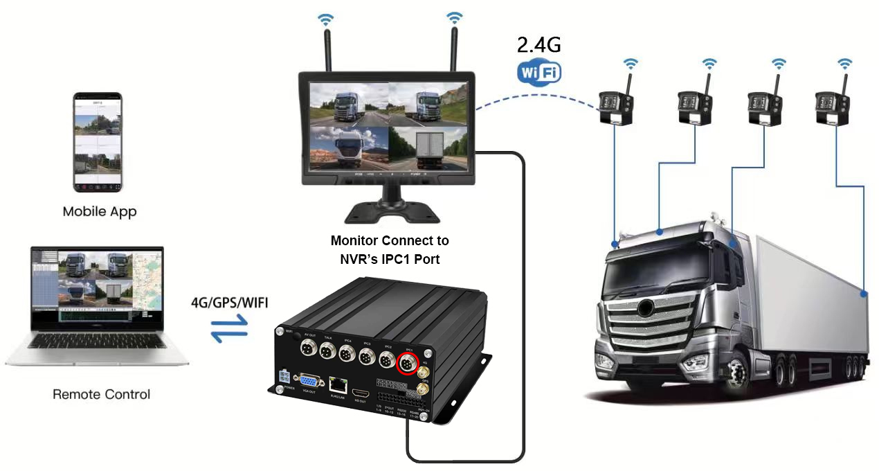 Zusätzliche 3-Kanal-Eingänge für kabelgebundene IP-KamerasCarleader 10,1 Zoll 7CH Wireless HDD Mobile NVR System, ein hochmodernes mobiles Wireless NVR System, das für das Flottenmanagement entwickelt wurde. Das System verwendet 4 drahtlose IP-Kameras, die über ein 2,4-GHz-Signal mit einem 10,1-Zoll-Wireelss-Relaismonitor gekoppelt sind, und verbindet dann den Relaismonitor und den NVR-IPC-Port über einen 6PIN-Luftfahrtanschluss. Es unterstützt auch zusätzliche kabelgebundene 3-Kanal-IP-Kameraeingänge.