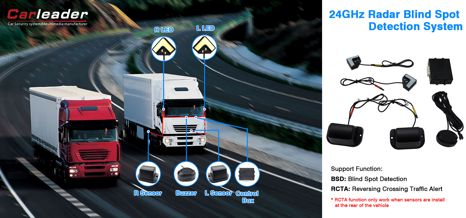 24 GHz Millimeter Wellenradar BSD Blind Spot Detektionssystem With RCTA -Funktion. Beim Umkehr überschreitet die relative Geschwindigkeit zwischen dem Auto und dem Objekt hinter dem Auto 8 km/h, die LED blinkt und der Summer alarmiert. Wenn Sie das 24 -GHz -Radar -Blind -Spot -Erkennungssystem -Benutzerhandbuch und weitere Informationen benötigen, senden Sie uns bitte eine Anfrage!