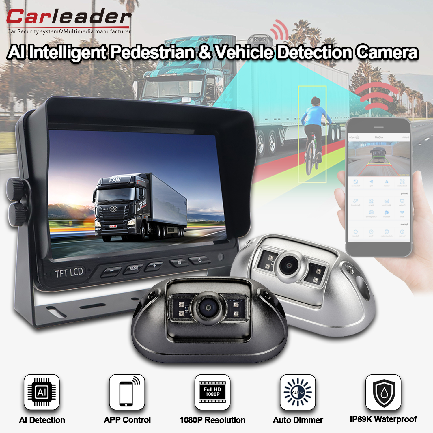 Unterstützt die AI-Kalibrierungseinstellung mit dem Mobiltelefon über WLANCarleaderAI BSD Fahrzeugkamerasystem zur Fußgänger- und Fahrzeugerkennung ein leistungsstarkes 7-Zoll-KI-BSD-System, das die Erkennung von Fußgängern und Fahrzeugen unterstützt und den Fahrer alarmiert. Kamera mit USB-Port-WLAN-Modul, ermöglicht dem Benutzer die Anpassung der AI-Funktionskalibrierung und der Grundeinstellungen der Kamera mit dem Mobiltelefon über eine WLAN-Verbindung, einschließlich Auflösungsoption,Erkennungsbereichskalibrierung, Art und Lautstärke des Alarmtons, Empfindlichkeit des Erkennungsauslösers, Erkennungsobjektoption usw. Helfen Sie dem Benutzer, sein Fahrzeug durch Anpassung besser anzupassen.