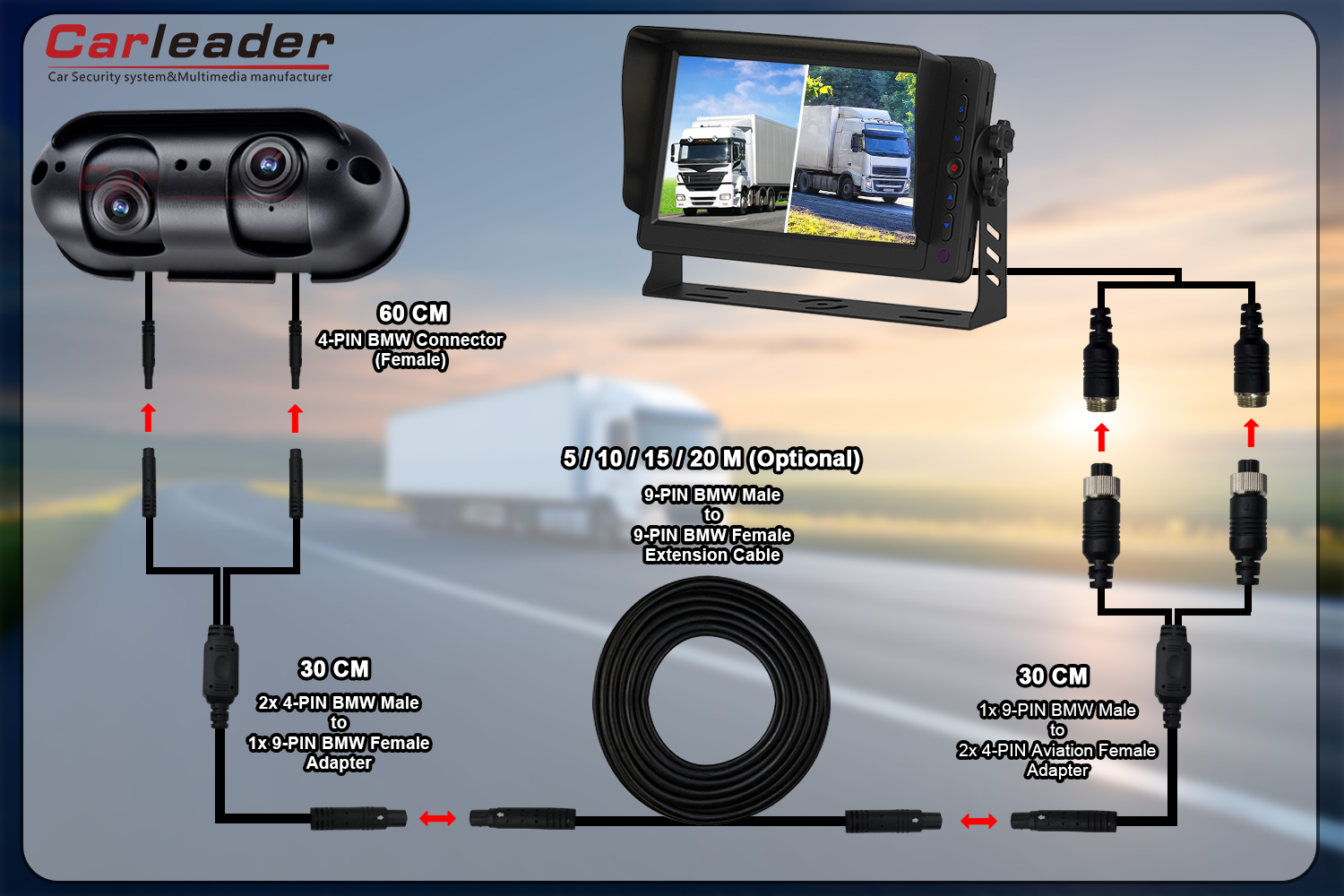 Bei der ersten Lösung wird nur ein Verlängerungskabel (9-poliger BMW-Stecker) und ein 1-zu-2-Splitkabel für beide Enden verwendet, um Kamera und Monitor zu verbinden. Da wir bei dieser Lösung nur auf Verlängerungskabel zurückgreifen, was den Verkabelungsprozess einfacher und bequemer macht.