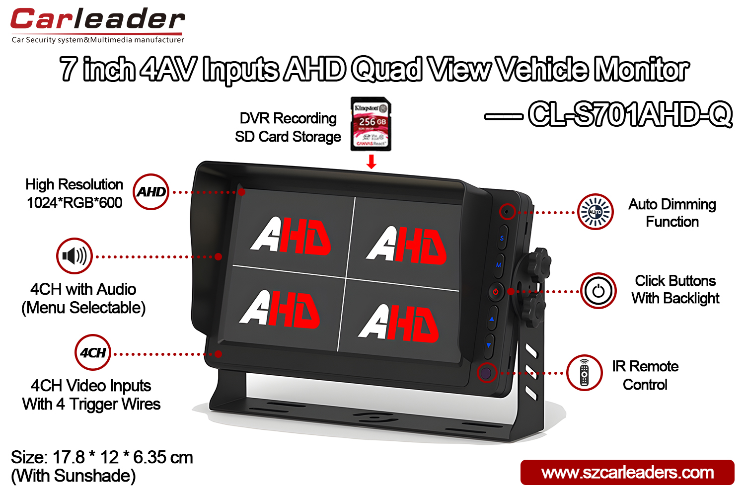 Carleader ist stolz, Ihnen unsere zu präsentieren7-Zoll-4-Kanal-AHD-Eingänge-Quad-View-Display-MonitorDas Quad-View-Design kann 4 Kanäle für Fahrzeugkameras unterstützen, z. B. Vorderansicht, Seitenansicht x2, Rückansicht, und ermöglicht es Fahrern großer Fahrzeuge (Busse, Lastwagen und Lieferwagen), mehrere Ansichten ihrer Umgebung zu überwachen, während sie das Fahrzeug bedienen.