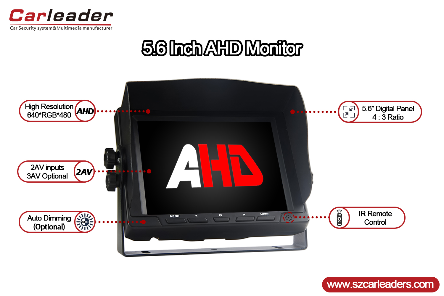 Carleader5,6 Zoll 2CH AHD-Eingänge Fahrzeug-Backup-MonitorIdeal für LKWs, Busse, Wohnmobile und alle Fahrzeuge, bei denen eine bessere Sicht nach hinten und Sicherheit im Vordergrund stehen. Seine langlebige Konstruktion, das übersichtliche Display und die praktischen Funktionen machen es zu einer zuverlässigen Komponente für moderne Fahrzeugkamerasysteme.