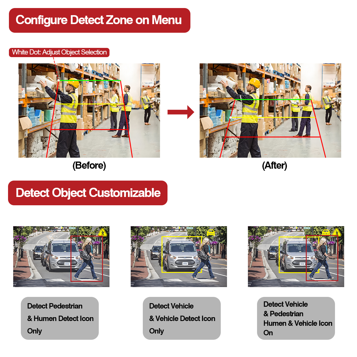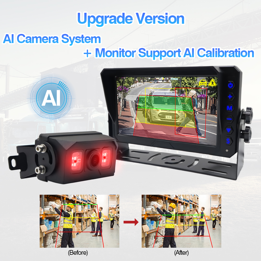 Die Carleader AI-Rückfahrkamera mit Erkennung des toten Winkels und integriertem Ton- und Lichtalarm kann allein ohne Verbindung zum Monitor als Alarmsensor arbeiten und kann auch mit unserem AI-Monitor zusammenarbeiten, der verschiedene AI-Kalibrierungen anpassen kann, wie z. B. die Anpassung des Erkennungsbereichs, den Alarmtyp, das Erkennungssymbol EIN/AUS usw.