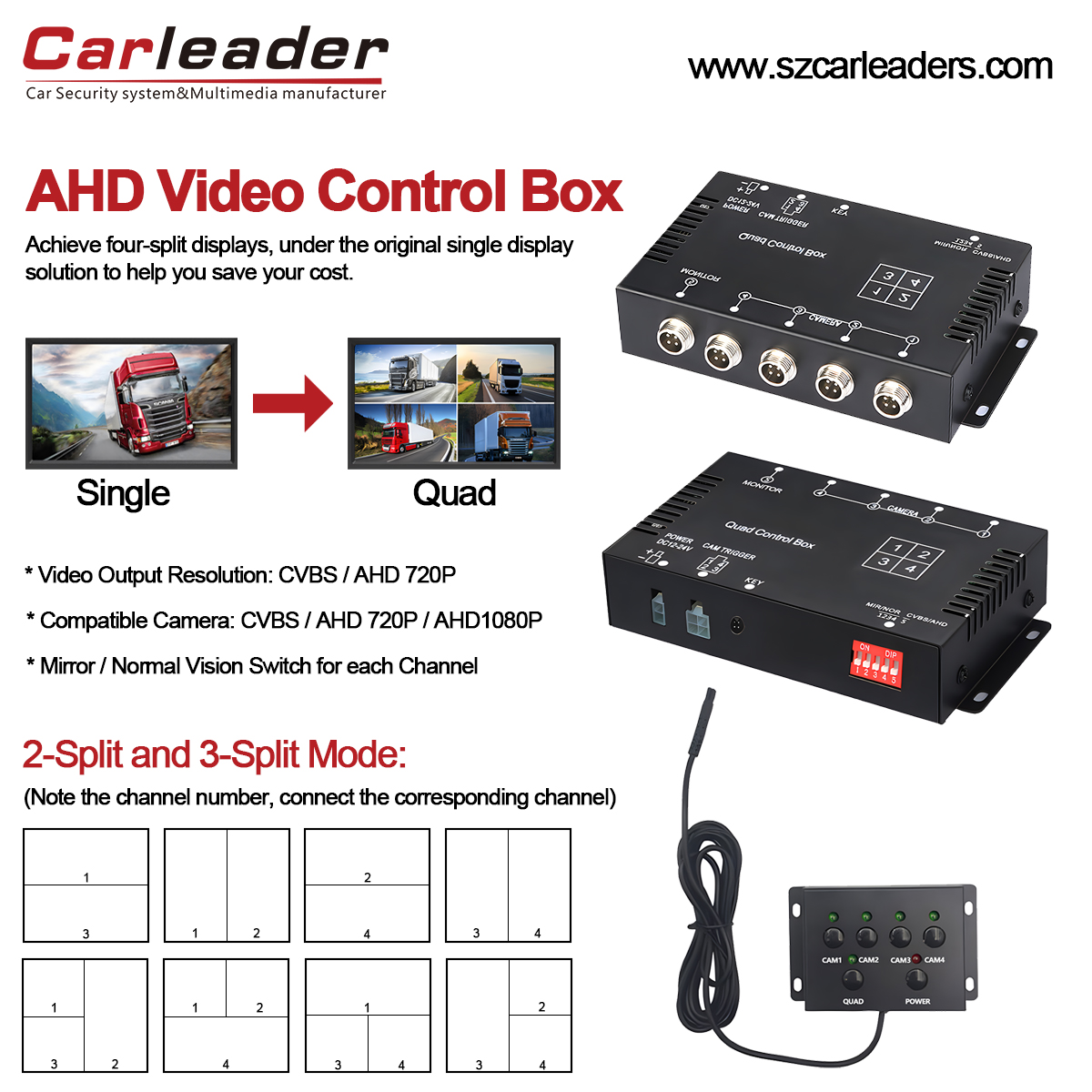 Lassen Sie uns darüber sprechen, was Sie über Carleader wissen müssenAHD Quad View Split Box Videoprozessorfür schwere Nutzfahrzeuge. Die AHD-Quad-Split-Steuerbox ist ein wichtiges Gerät für ein Fahrzeug-CCTV-Überwachungssystem. Die Video-Split-Steuerbox für Bus-LKW unterstützt die Umwandlung eines einzelnen Monitors in einen Quad-View-Monitor und kann mit 4 AHD-Autokameras verbunden werden. Im Folgenden finden Sie eine detaillierte Erläuterung der Funktionen, Merkmale und typischen Anwendungsfälle der AHD-Rückfahrkamera-Videosteuerbox.