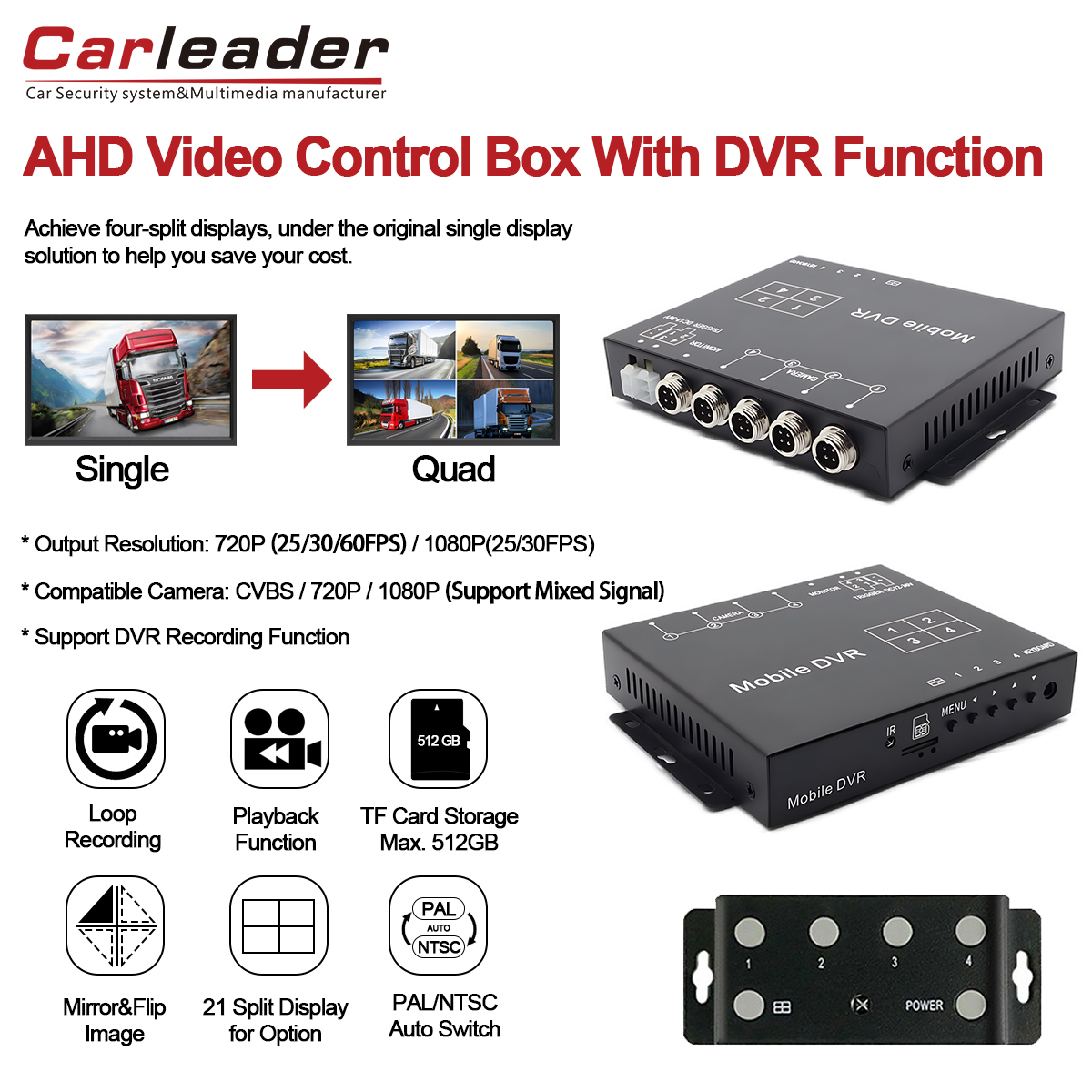 Erweitern Sie das Fahrzeugüberwachungssystem mitCarleader 1080P AHD Quad Split Display Videoprozessor unterstützt Videoaufzeichnung, eine vielseitige 4-Kanal-Video-Splitterbox mit integrierten erweiterten DVR-Aufzeichnungsfunktionen. Dieses kompakte Gerät wurde für zuverlässige, flexible und hochauflösende Überwachung entwickelt und eignet sich ideal für das Flottenmanagement, Sicherheitsfahrzeuge oder alle Anwendungen, die ein System zur Aufzeichnung und Anzeige von Eingaben mit mehreren Kameras erfordern.