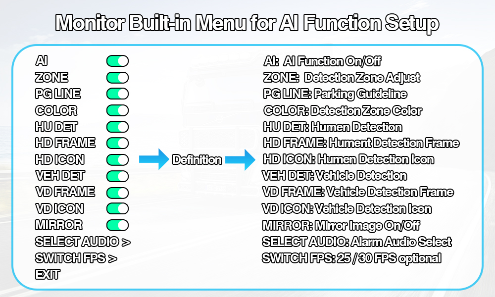 Anpassbare KI-Kalibrierung: Passen Sie die KI-Erkennungsbereiche ganz einfach über das intuitive Bildschirmmenü des Monitors an. Außerdem können Sie wählen, ob nur Fußgänger, nur Fahrzeuge oder beides überwacht werden sollen – mit ein-/ausschaltbaren Erkennungsrahmen- und Objektsymbol-Überlagerungen (Fußgänger oder Fahrzeug) für klares visuelles Feedback.